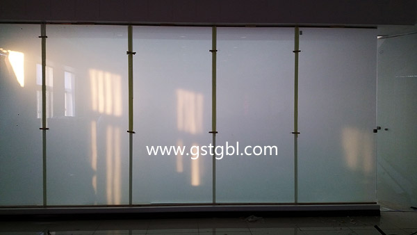 將具有開關(guān)功能的液晶薄膜,通過夾膠復(fù)合在兩片玻璃中間,利用液晶特性,只需對電源進(jìn)行控制,便可使玻璃在瞬間轉(zhuǎn)換透明與不透明的效果。通過加裝自行研制調(diào)頻電源的調(diào)光玻璃看顯示器(屏)可使圖像無閃屏更清楚。
